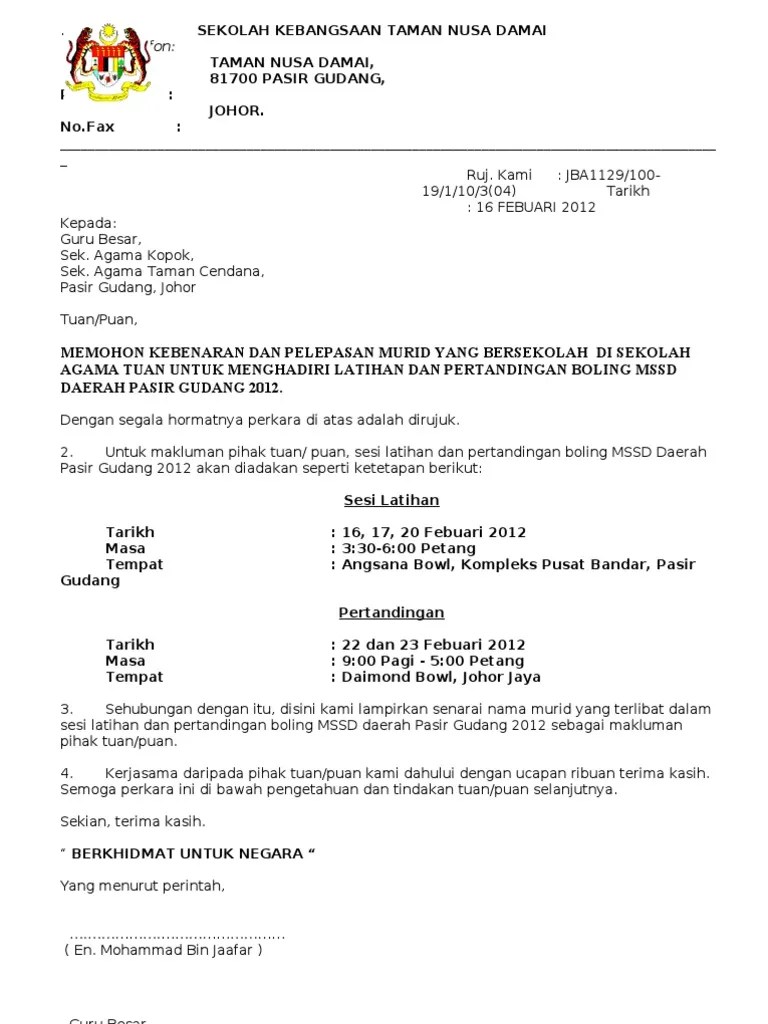 Institut pendidikan guru malaysia kampus darulaman bandar darulaman 06000. Surat pelepasan kuliah the assortment of images contoh surat resmi pelepasan kelas xii that are elected immediately by the admin and with . Silahkan kunjungi postingan contoh surat undangan bupati acara perpisahan/pelepasan siswa sekolah kelas xii tahun 2017 untuk membaca artikel selengkapnya. Contoh surat memohon pengecualian kuliah 2 docx anas bin mohd hanafiah d20171077586 fakulti bahasa dan komunikasi universiti pendidikan . Contoh surat undangan perpisahan kelas 6 studi indonesia . Contoh surat pengecualian kursus induksi. Text of surat pelepasan kuliah. Tuan, memohon kelulusan pelepasan kuliah bagi . Nurul syuhada bt mohd roki c307/3b, kolej aminuddin baki, kampus sultan azlan shah, universiti pendidikan sultan idris, . Pensyarah, tg40703 pengurusan dan pengelolaan kokurikulum, sekolah pendidikan dan pembangunan sosial, ums. Surat pelepasan kuliah bagi jawatankuasa karnival permainan tradisional. Contoh surat kuasa yang benar dan turorial lengkap cara membuatnya. Menurut makluman terkini, bagi anda yang tidak walaupun peruncitan dibenarkan, tetapi untuk urusan cash of .
